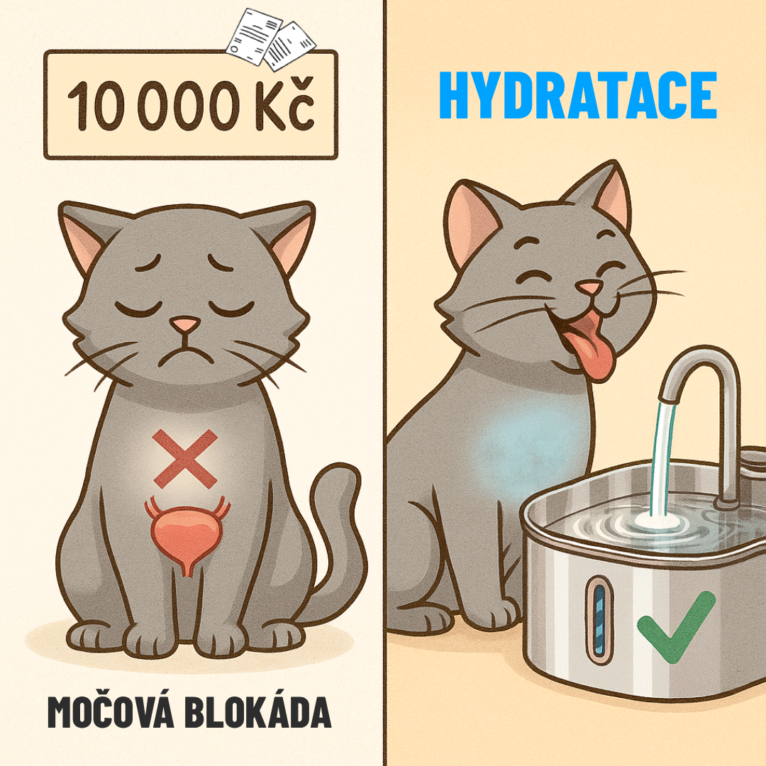Stojící voda → Kočka pije málo → Nedostatečná hydratace → Zahušťování moči → Riziko močových problémů